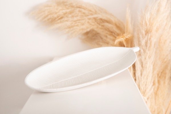 Minimalista, elegante y versátil. Esta bandeja en forma de hoja, con acabado blanco texturado, es perfecta para complementar la decoración de cualquier ambiente. Ideal para usar como centro de mesa, apoyar velas, bijouterie o simplemente dar un detalle natural y sofisticado a tus espacios.