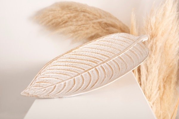 Elegancia y estilo natural en un solo objeto. Esta bandeja en forma de hoja, con terminación en tonos beige y blanco, es ideal para realzar cualquier rincón de tu hogar. Perfecta para usar como centro de mesa, para apoyar velas, sahumerios o pequeños accesorios decorativos.