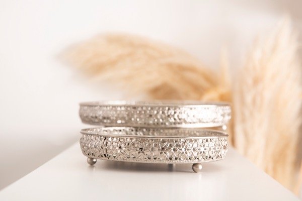 Bandejas decorativas metálicas con delicado diseño calado en acabado plateado con espejo. Elegantes y versátiles, ideales para organizar perfumes, velas, joyas o destacar como centro de mesa. Su estilo sofisticado aporta un toque de brillo y distinción a cualquier ambiente, combinando con decoraciones clásicas, modernas o glam. ✨