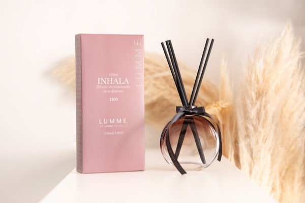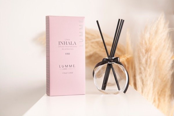 Elegancia, frescura y diseño se combinan en la línea Inhala de Lumme, creada para aromatizar tus ambientes y darles un toque sofisticado. Su envase de vidrio esférico con lazo negro lo convierte en un accesorio decorativo ideal para cualquier rincón del hogar u oficina.
