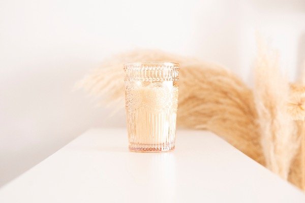 Elegante y delicada, esta vela viene en un vaso de vidrio con detalles tallados que reflejan la luz y aportan un toque sofisticado a cualquier espacio.