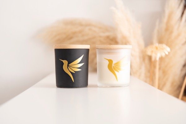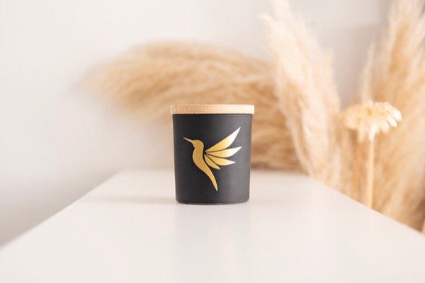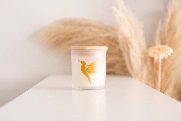 El diseño minimalista se realza con el detalle del colibrí dorado, símbolo de energía y delicadeza, lo que convierte a esta vela no solo en un objeto decorativo, sino también en un regalo ideal.